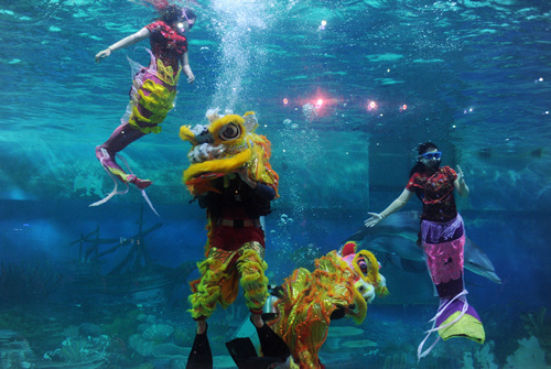 2014年1月31日,雅加达水下剧院举行水下舞狮表演,庆祝春节。