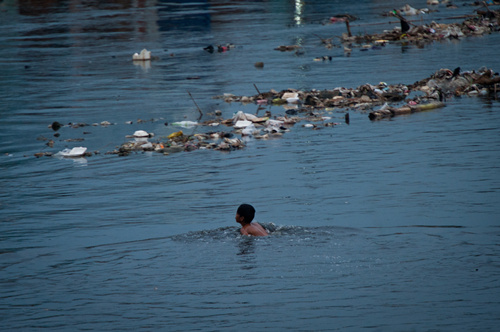 2014年10月6日,一名儿童在雅加达一处平民窟附近游泳。
