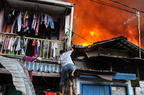 2015年3月5日,雅加达一处居民区发生火灾,一名居民从自家房屋逃出。