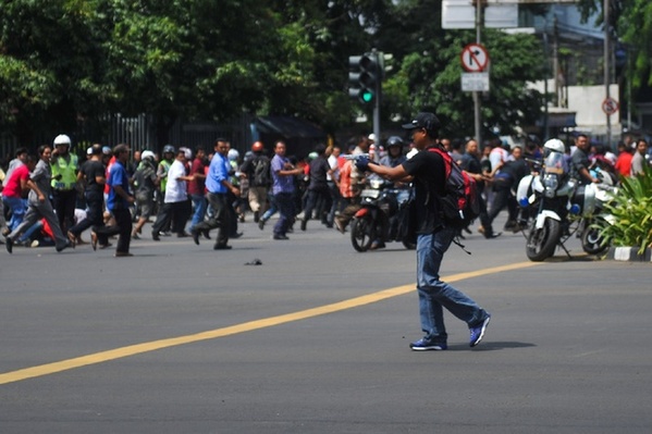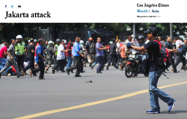 新华社雅加达分社摄影雇员维里·桑诺弗里在现场近距离拍摄到一组枪手向人群射击的独家照片,第一时间被国际主流媒体采用,传遍全球。同行和普通读者为维里的勇气和职业精神点赞。