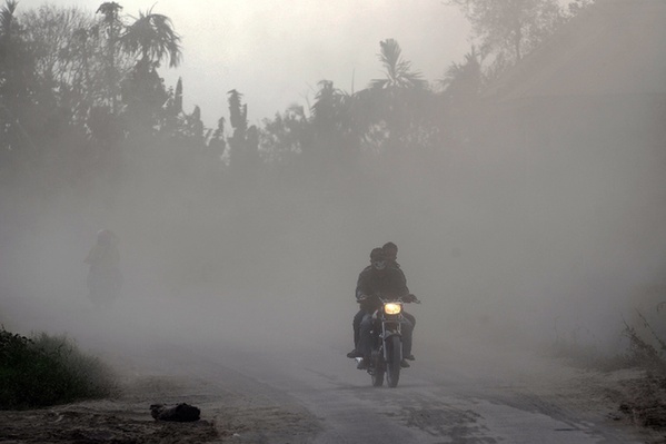 2014年2月2日,在印度尼西亚北苏门答腊省的一个村庄,当地居民骑摩托车在被火山灰覆盖的道路上行驶。