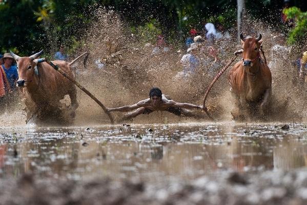 2014年6月14日,西苏门答腊省农民举行传统的田间骑牛比赛。