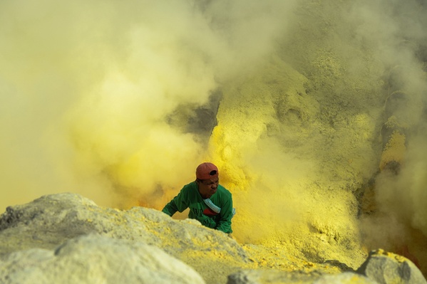 2015年5月14日,一名工人在东爪哇省的一处硫磺矿工作。