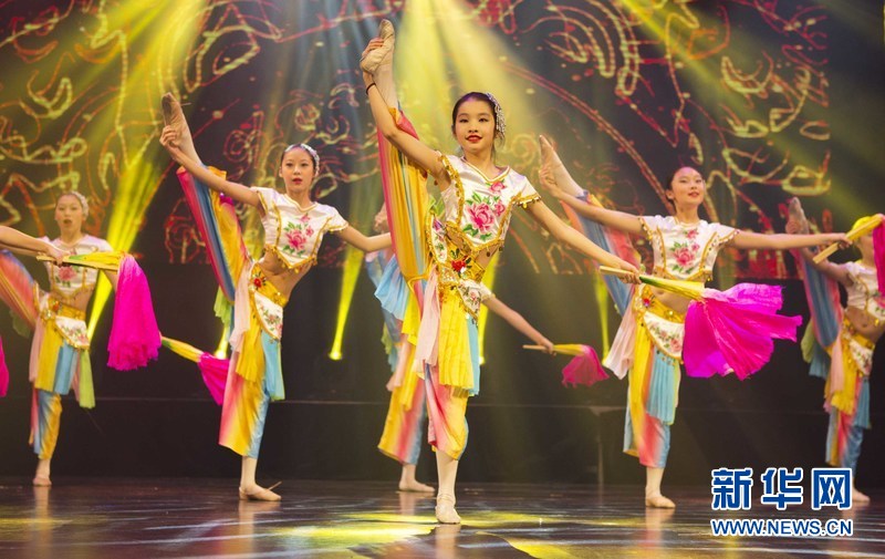 1月17日,在加拿大大多伦多中华文化中心何伯钊剧院,演员在表演舞蹈《扇舞迎春》。新华网发(邹峥摄)