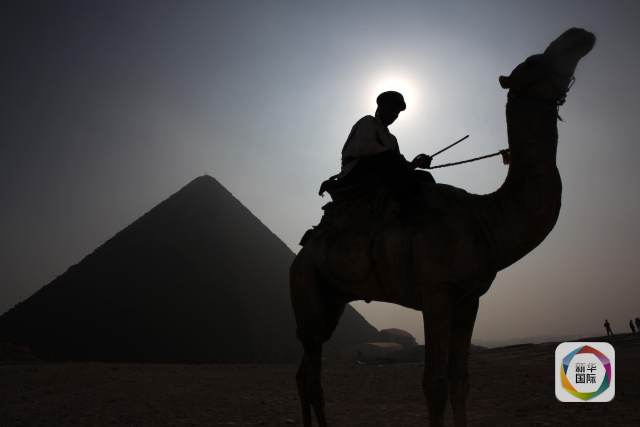 图为在埃及首都开罗,游客骑着骆驼游览金字塔。