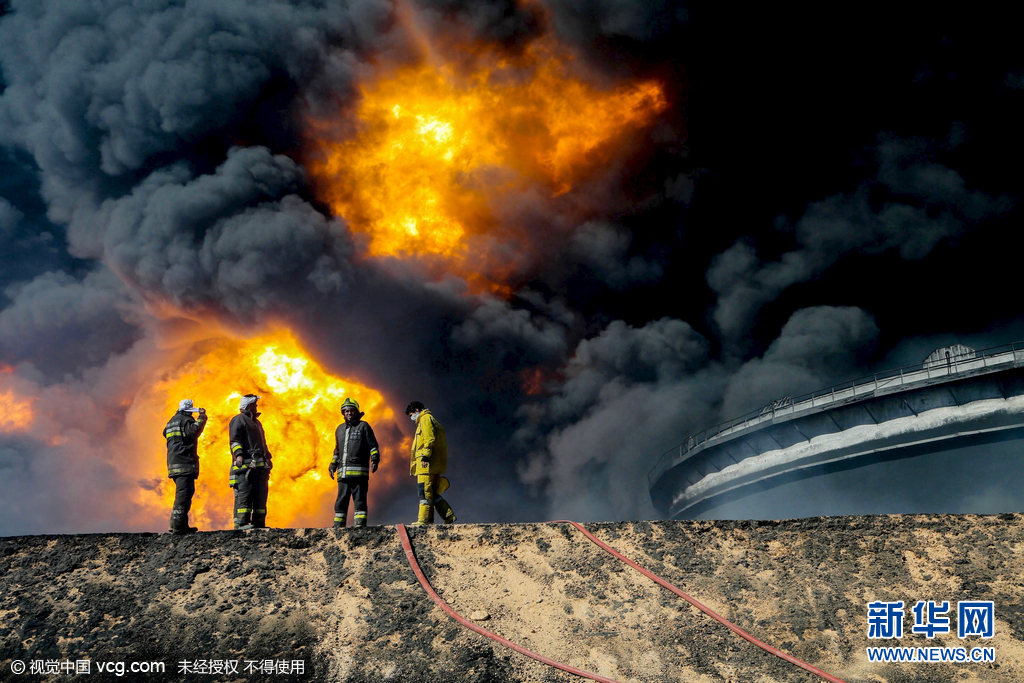 当地时间2016年1月4日-6日,利比亚拉斯拉努夫港口的油罐起火。一名石油安保系统的发言人称,“伊斯兰国”武装分子袭击引发火灾,消防员已经扑灭两个起火油罐,仍有五个火势凶猛。图片来源:视觉中国