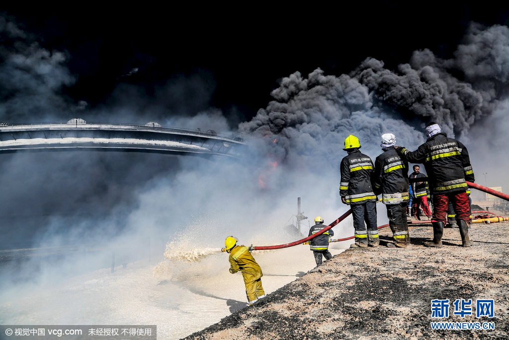 当地时间2016年1月4日-6日,利比亚拉斯拉努夫港口的油罐起火。一名石油安保系统的发言人称,“伊斯兰国”武装分子袭击引发火灾,消防员已经扑灭两个起火油罐,仍有五个火势凶猛。图片来源:视觉中国