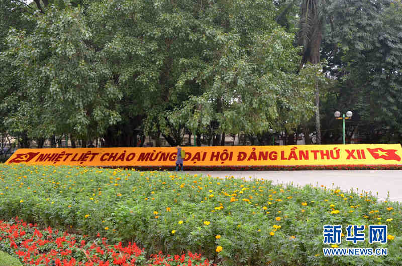 1月20日,在越南首都河内,一名护花工人在给庆祝越共十二大的花卉喷水。越南共产党第十二次全国代表大会将于2016年1月20日至28日召开。在大会召开前,越南首都河内许多街道挂满了越南国旗、党旗,主要路口摆放着宣传越共十二大的花卉和标语,以迎接越共十二大。新华网记者闫建华摄