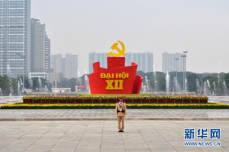 1月20日,在越南首都河内,一名交警在举行越共十二大的国家会议中心执勤。越南共产党第十二次全国代表大会将于2016年1月20日至28日召开。在大会召开前,越南首都河内许多街道挂满了越南国旗、党旗,主要路口摆放着宣传越共十二大的花卉和标语,以迎接越共十二大。新华网记者闫建华摄