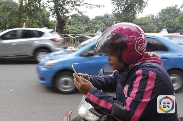 1月11日,印尼雅加达,一名女性摩的司机使用智能手机寻找顾客。(图片来源:新华/路透)