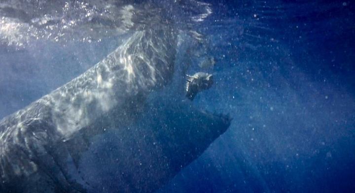 视频中,艾尔克将系在绳上还流着血的金枪鱼投放在水下,成功引来一条约5 米长的雄性大白鲨。身在安全铁笼中的她牵着那根绳,将鲨鱼引向摄像机可拍摄到的区域,突然鲨鱼一跃而起,头部直立在水面之上,猛烈地撕咬着绳子上的金枪鱼,激起了很大的浪花,尽展大白鲨的凶悍。