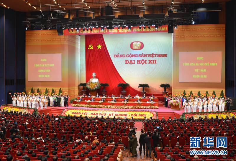 1月21日,在河内举行的越共十二大会议现场。当日,越南共产党第十二次全国代表大会在首都河内国家会议中心正式开幕。越共十二大于1月20日至28日在河内召开,届时将选出新一届中央委员会,并在此基础上选出包括越共中央总书记、中央政治局委员等在内的越共新一届领导层。代表越南450多万名党员的1510名代表出席会议。新华网记者闫建华摄
