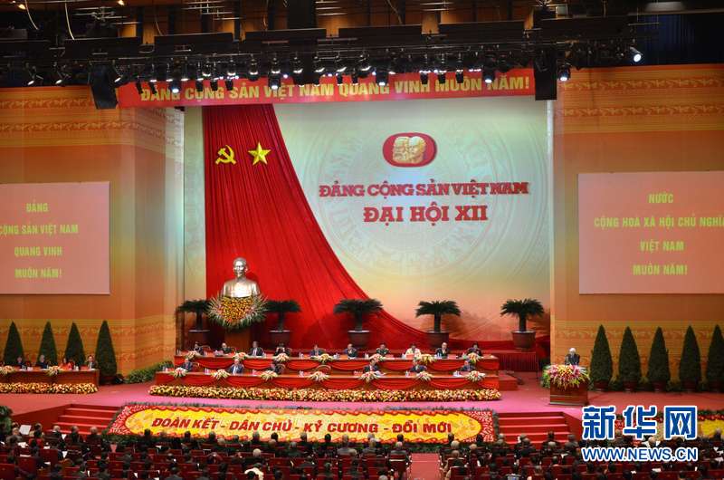 1月21日,在河内举行的越共十二大会议现场。当日,越南共产党第十二次全国代表大会在首都河内国家会议中心正式开幕。越共十二大于1月20日至28日在河内召开,届时将选出新一届中央委员会,并在此基础上选出包括越共中央总书记、中央政治局委员等在内的越共新一届领导层。代表越南450多万名党员的1510名代表出席会议。新华网记者闫建华摄