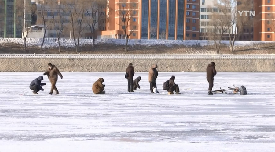 朝鲜体感温度达零下24度 平壤市民江上破冰钓鱼(图)