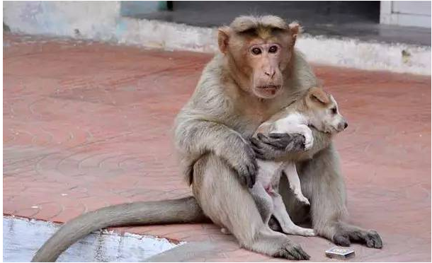 有网友指出,这只猴子妈妈很可能是因为在生下小猴不久后,小猴就夭折了,受不了刺激的猴子妈妈看到这只小狗后就把当成了自己的孩子,然后就把它抱走从此喂养它。