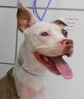 这是只左撇子的斗牛犬。一天,当4个持械抢劫犯闯入它的家,它跳到主人面前,帮它主人挡了一颗子弹。它严重受伤,不得不截去一条腿,但它活了下来。这是只快乐,英雄小狗。