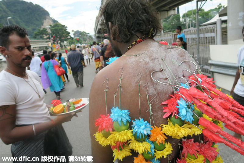 当地时间2016年1月21日,马来西亚黑风洞,信徒背上穿着钩子朝穆卢干王寺朝圣。为了避免1月24日大宝森节当天太过拥挤,一些信徒提前过节,进行自残的形式进行忏悔赎罪。Munhoe Chan/东方IC