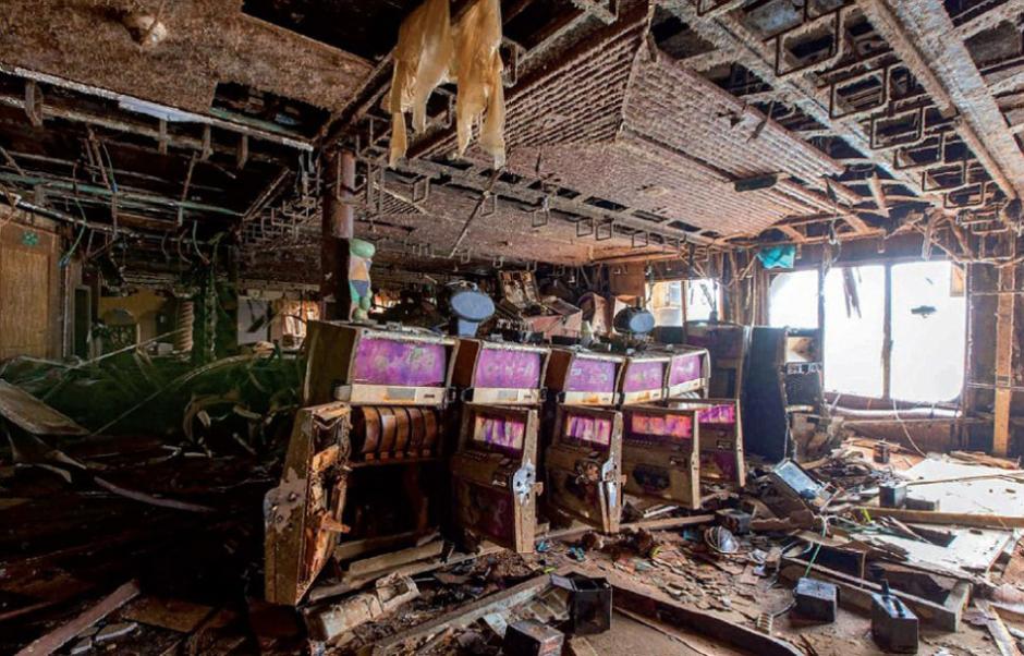 赌场舱室特写照显示,老虎机空空荡荡地被扔在这里,门都开着。