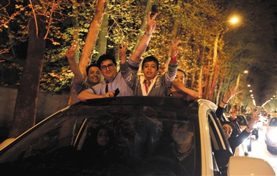 2015年4月2日,伊朗德黑兰,伊朗人涌入街头狂欢,庆祝伊朗核谈判达成框架性协议。