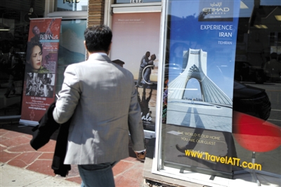 2015年7月14日,美国洛杉矶,旅行社门口张贴推广前往伊朗旅行的海报。多国对伊朗解除制裁,可能会带动赴伊旅游热。图/CFP