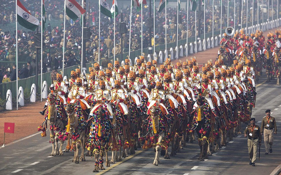 据每日邮报,印度将于1月26日举办“共和国日”大型庆典,届时将有大规模的部队游行。23日新德里进行了游行彩排,坦克、战斗机、导弹和“军犬小分队”齐上阵,场面十分壮观。图为印度边境安保部队的士兵骑着骆驼亮相。