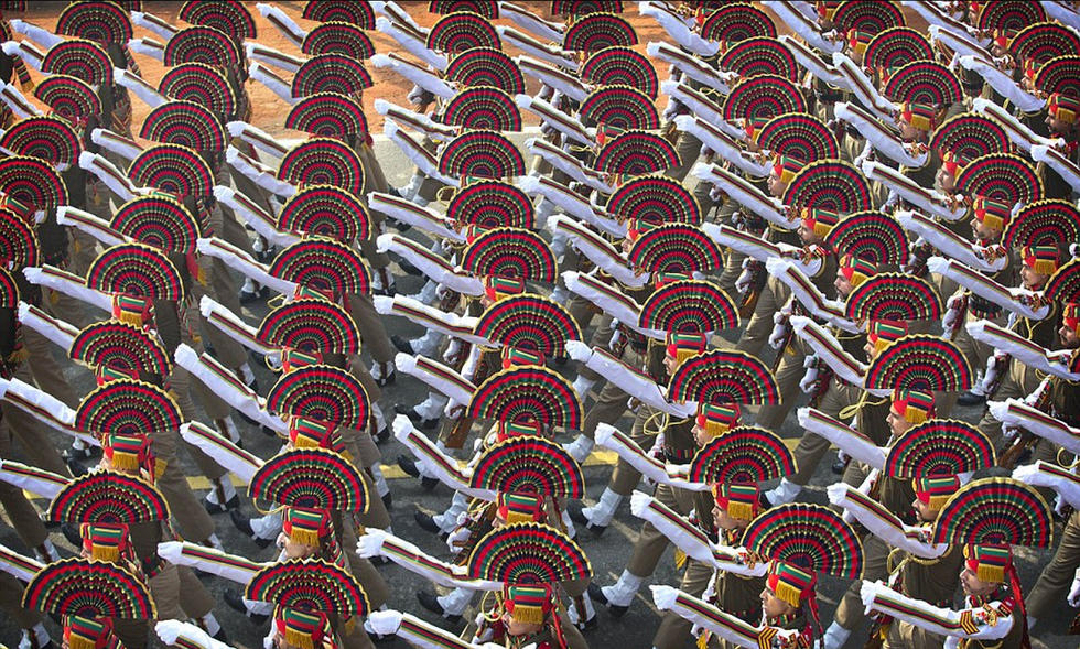 印度共和国日庆典彩排 女兵方阵头戴“花帽”亮相(组图)