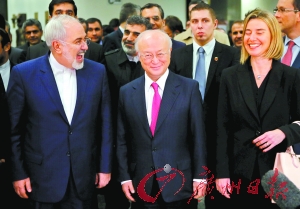 本月16日,奥地利维也纳,伊朗外长扎里夫、国际原子能机构总干事天野之弥与欧盟外交和安全政策高级代表莫盖里尼抵达联合国大厦。