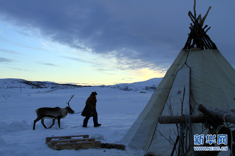 1月24日,一个萨米人拉着驯鹿经过传统帐篷。新华网记者张淑惠摄