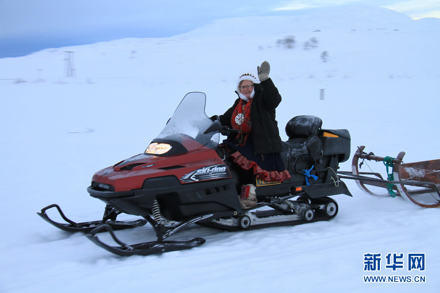 1月24日,一位萨米老太太特罗姆瑟郊区开着雪地摩托和游客挥手再见。新华网记者张淑惠摄
