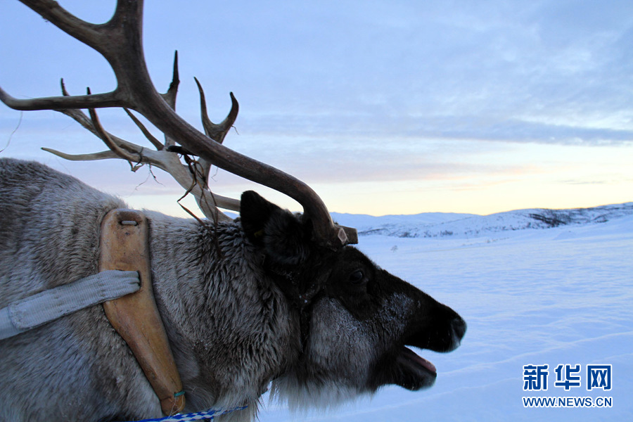 1月24日,一头驯鹿正在挪威北部最大城市特罗姆瑟郊区拉雪橇。新华网记者张淑惠摄