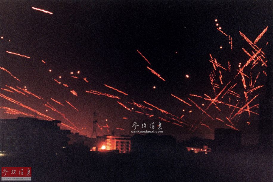 巴格达时间1991年1月17日凌晨,以美国为首的多国部队对伊拉克发动“沙漠风暴”作战行动,数百架联军战机以及数百枚巡航导弹对包括伊拉克首都巴格达在内的多个要害目标发动空袭行动,拉开了海湾战争的序幕。图为1月17日凌晨,防空曳光弹密布的巴格达夜空。