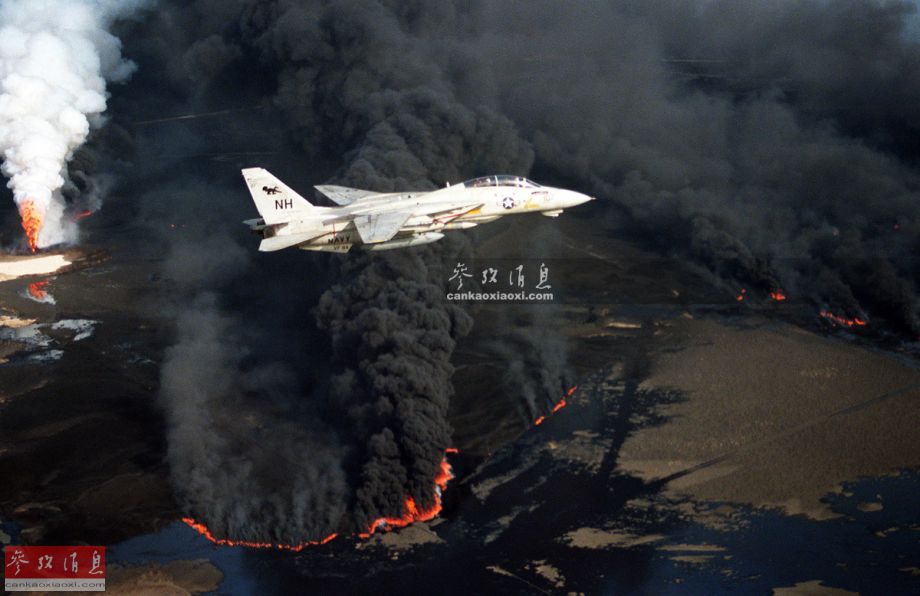 “沙漠风暴”行动期间,一架隶属于美海军VF-114舰载战机中队的F-14A重型战机飞越被点燃的科威特油井。