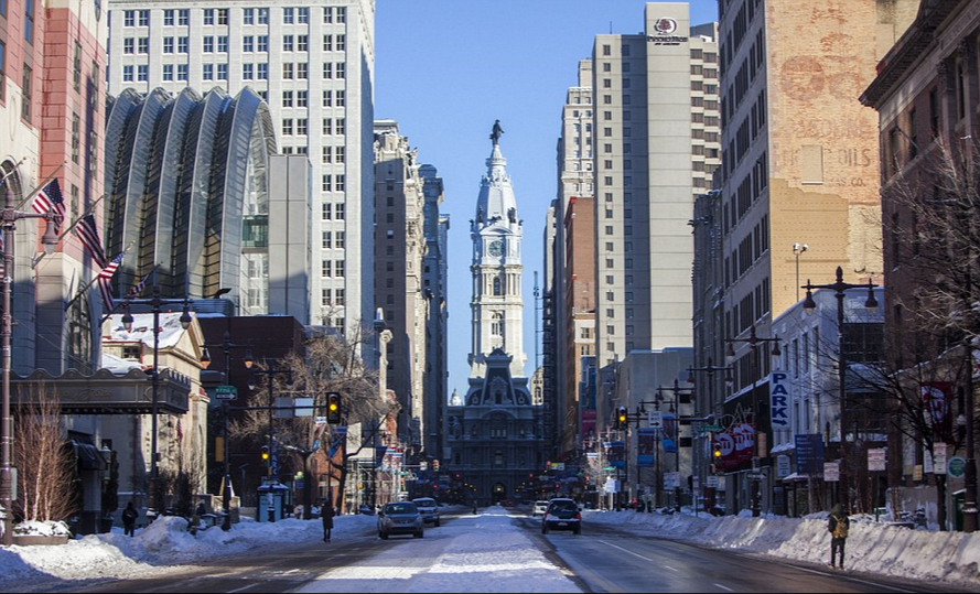 阳光投射在费城的高楼大厦上,尽管地面积雪已经基本清理完毕,行人走在道路上仍感觉有些冷。