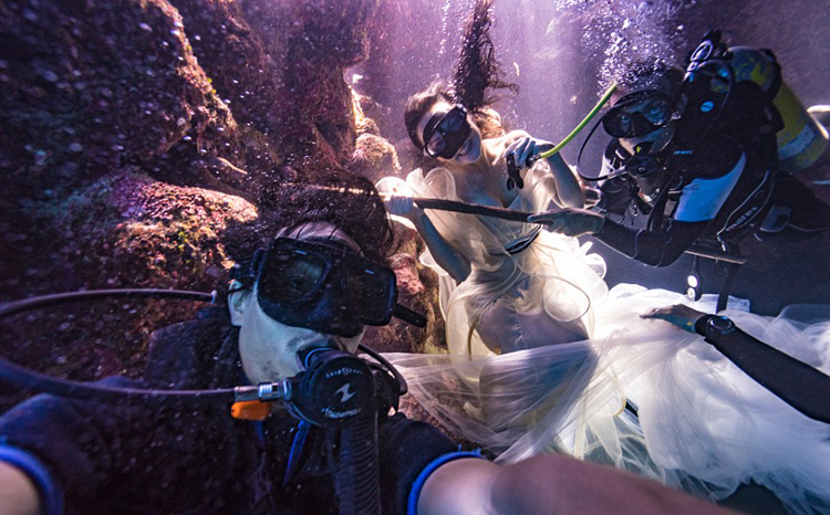 这位摄影师名叫本杰明·冯·王(Benjamin Von Wong)。在本杰明最新的摄影作品中,模特安伯·伯尔克(Amber Bourke)身穿一袭白色纱裙,与水底小鲨鱼们和谐共存。据悉,此次拍摄得到了斐济当地专业的潜水人员和海洋生物专家的大力支持与配合。