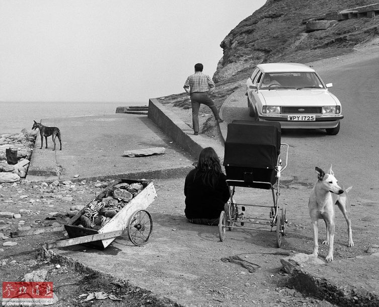 在北约克郡,一对情侣和他们的两只狗在海边。命名为《车与人》。