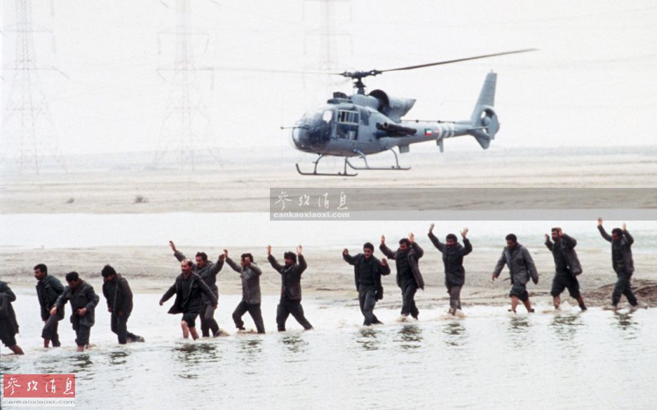 1991年2月25日,科威特东南部,一架科威特“小羚羊”直升机正在押运一队投降的伊军战俘。