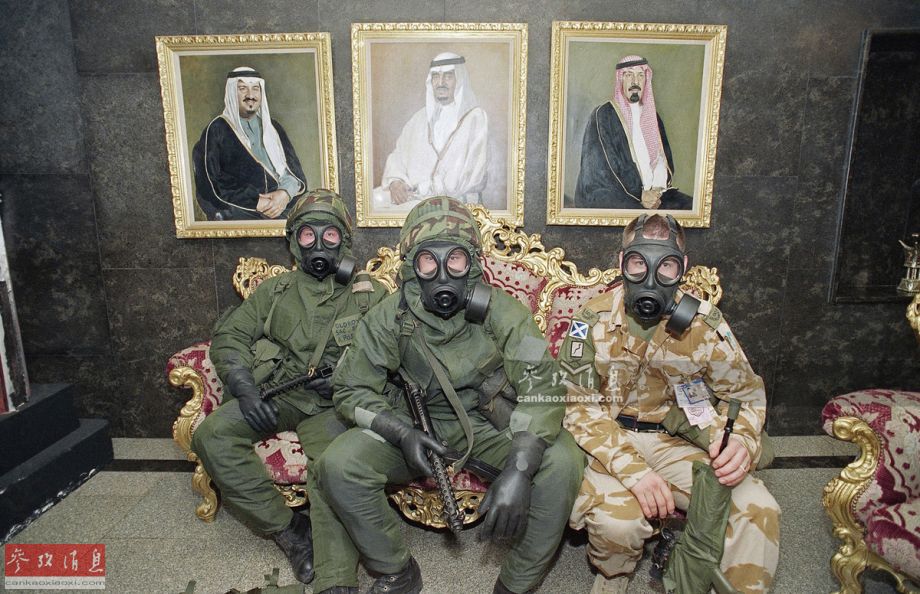 1991年2月26日,沙特东北部城市达兰,当日一枚飞毛腿导弹来袭时,几名英军士兵穿好全套防护服在当地的一家酒店内合影。