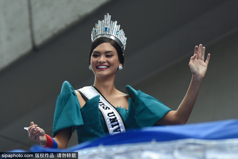 当地时间2016年1月25日,菲律宾马尼拉,菲律宾小姐皮雅·阿龙佐·乌兹巴赫(Pia Alonzo Wurtzbach)夺得2015环球小姐冠军,胜利归国游行受支持者追捧。(图片来源:希帕中国)
