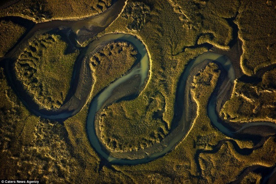 沼泽的另一张照片,一条长长的河流穿过灌木和茂密的丛林,蜿蜒前进。