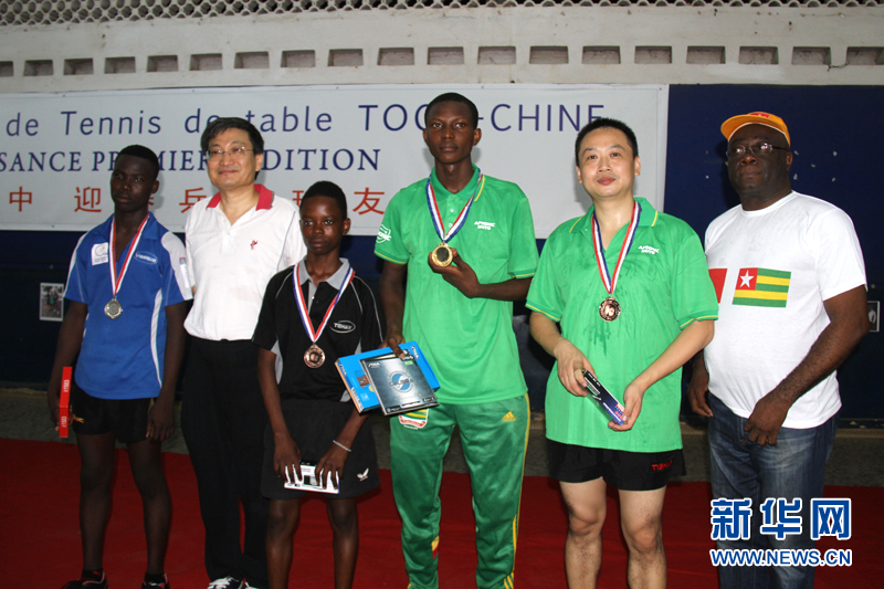 中国驻多哥大使刘豫锡(左二)、多哥乒乓球协会主席洛科·科优(右一)与获奖选手合影。新华社记者张改萍摄