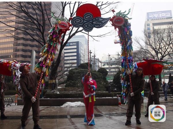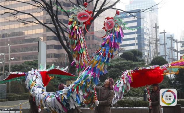 1月26日,在韩国首尔闹市区,来自湖北十堰的民间艺人表演凤凰灯舞。