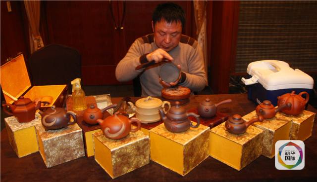 1月26日,在韩国首尔市乐天酒店内,湖北民间艺人在展示鄂派紫砂壶陶艺的制作。