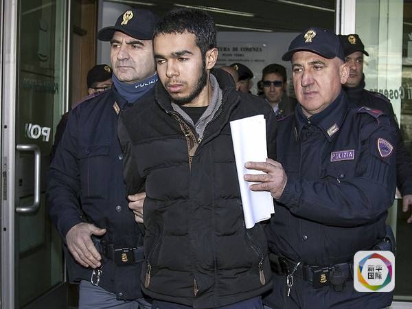 1月25日,意大利科森扎市,两名警察押解着摩洛哥男子迈赫迪·哈米勒离开警察局。意大利警方说,这名男子居住在意南部,去年7年曾准备前往土耳其。意警方怀疑哈米勒前往土耳其意在寻求接受“伊斯兰国”武装训练。(新华/美联)