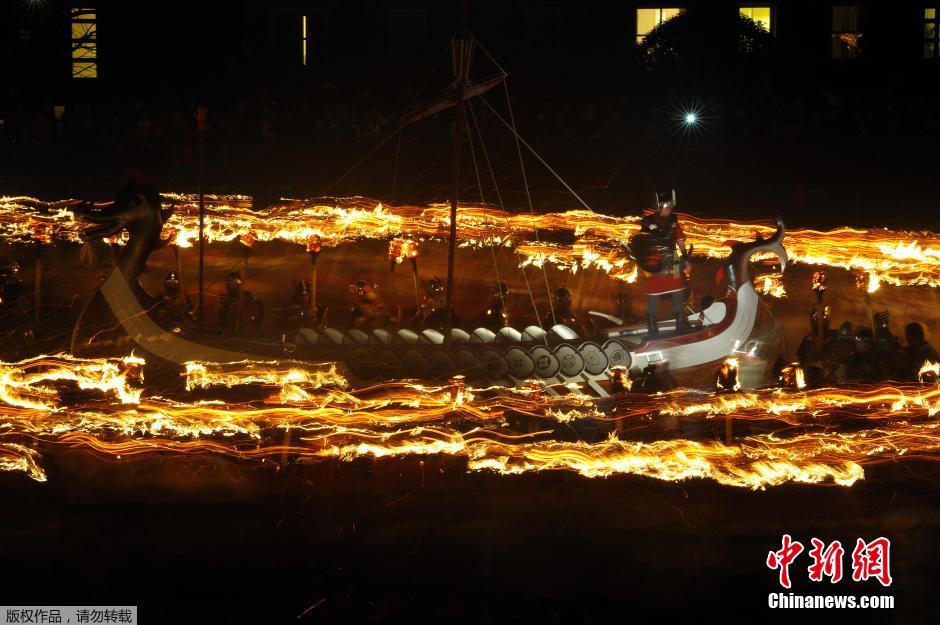 当地时间2016年1月26日,英国设得兰群岛迎来维京火祭节。维京火祭(Up Helly Aa festival)是英国苏格兰东北部设得兰群岛的传统节日。其于每年1月份的最后一个星期二举行。在维京火祭上,数千人将装扮成维京战士的模样,站在维京战船花车上接受人民的祝福。最后“维京战士”将把所有的火把扔向战船。这是节日的高潮部分。