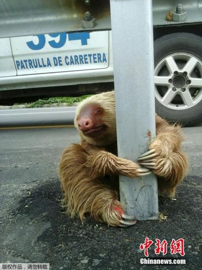 树懒误闯高速被“吓尿” 紧抱柱子不放萌萌哒(图)