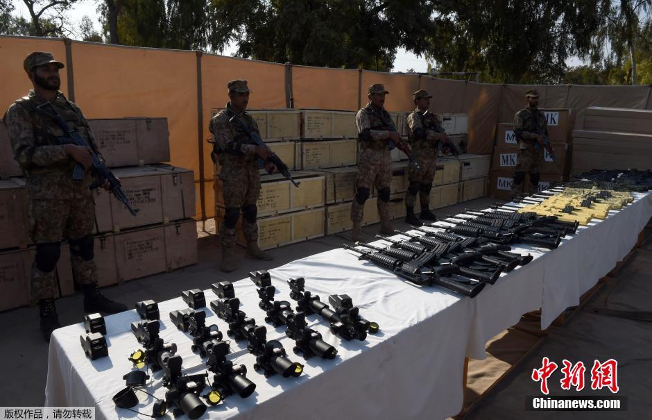 当地时间2016年1月27日,巴基斯坦白沙瓦,巴基斯坦士兵向媒体展示缴获的武器。