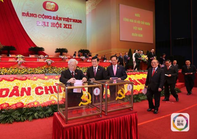 2016年1月26日,在越南首都河内,参加越南共产党第十二次全国代表大会的越共中央总书记阮富仲、越南国家主席张晋创、越南总理阮晋勇和越南国会主席阮生雄等人投票选举越共十二届中央委员会。新华社/越通社