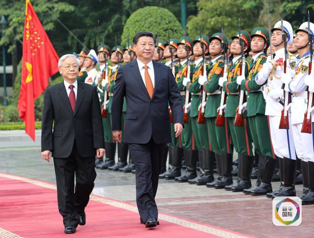 2015年11月5日,中共中央总书记、国家主席习近平在河内同越共中央总书记阮富仲举行会谈。会谈前,阮富仲在主席府广场举行盛大欢迎仪式。这是习近平在阮富仲陪同下检阅仪仗队。 新华社记者兰红光摄