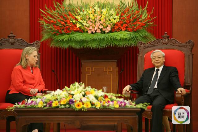 2012年7月10日,在越南河内,到访的时任美国国务卿希拉里·克林顿与越南共产党中央总书记阮富仲举行会谈。新华社发(胡如意摄)