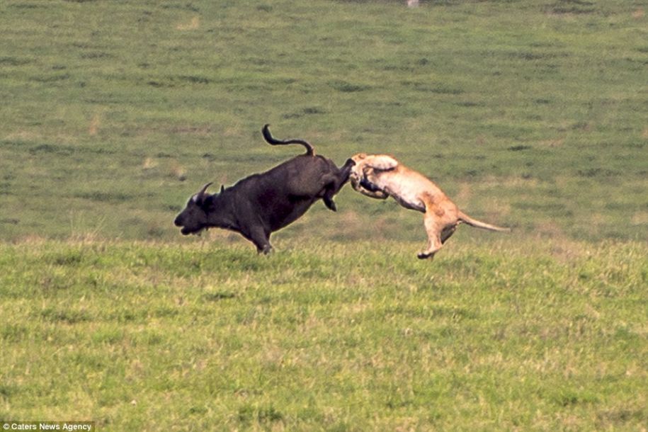 正中面门!狮子捕食水牛反被踹脸一幕(高清组图)